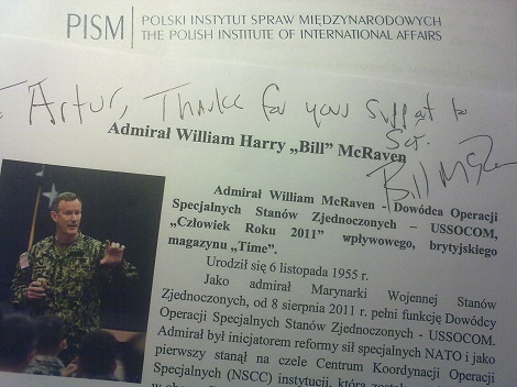 Admirał William Harry „Bill” McRaven jest nie tylko komandosem. Okazał się człowiekiem dostępnym, kulturalnym, dostojnym, elokwentnym, dyplomatą ale potrafiącym żartować także z siebie. Na koniec naszej indywidualnej rozmowy, na moje przeprosiny za mój angielski zareagował dość niespodziewanie: „przepraszasz? ale za co? to ja przepraszam, że mój polski nawet w najmniejszym stopniu nie jest taki jak twój angielski…”