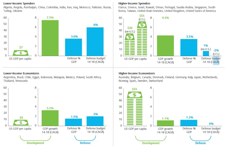 Według tego podziału Polska (wraz z Argentyną, Brazylią, Chile, Egiptem, Indonezją, Malezja, Meksykiem, Południową Afryką, Tajlandią i Wenezuelą) znalazła się w grupie „Lower-Income Economizers” (grupie przeznaczającej na obronę poniżej 2% PKB). W Polsce od lat roczne wydatki na obronność oscylowały wokół 1,9 proc. PKB, jednak od przyszłego roku będzie to 2 proc.